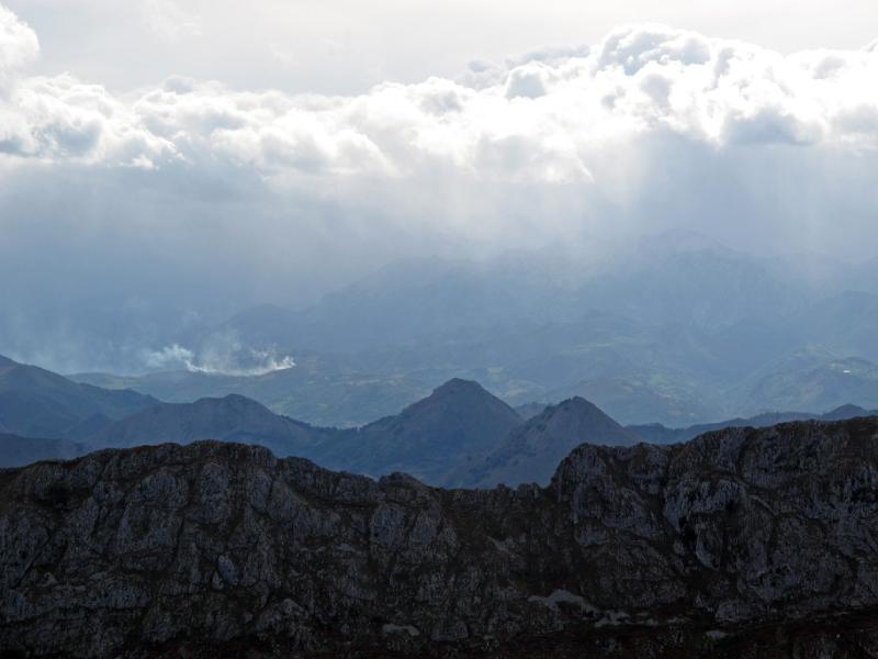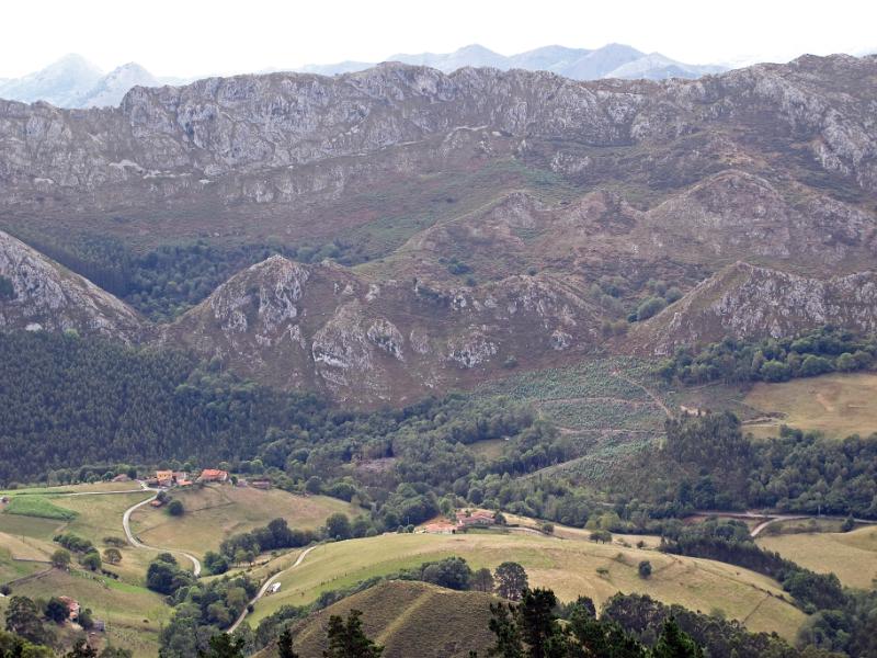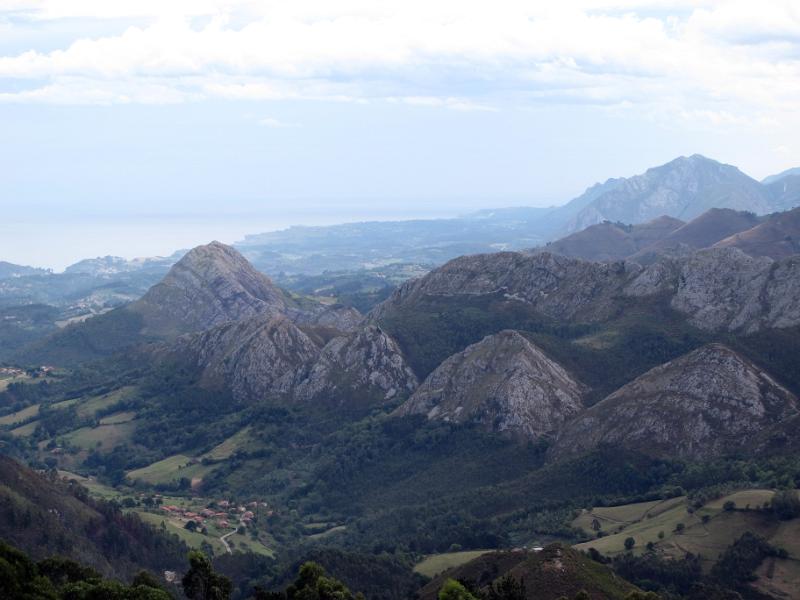 On route to the fishing village of Lastres: view from a viewpoint called the Mirador del Fito, which offers superb views of the ocean, valleys and the Picos de…